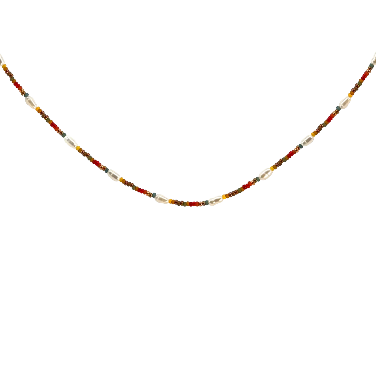 Fedezd fel az ősz varázsát ezzel a fiatalos és lendületes nyaklánccal, amelyet az évszak meleg árnyalatai ihlettek! A gondosan válogatott design gyöngyök – az aranyló barna, sárgás és vöröses árnyalatú kásagyöngyök – harmonikusan ötvöződnek a gyengéd, rizsszem formájú fehér édesvízi gyöngyökkel, megidézve a lehulló levelek és a napfényben fürdő természet színeit. Ez a nyaklánc nemcsak elegáns és természetes szépségű, hanem praktikus is – a lánchosszabbító segítségével könnyedén beállítható a kívánt méretre, így mindig kényelmes viseletet és tökéletes megjelenést biztosít.