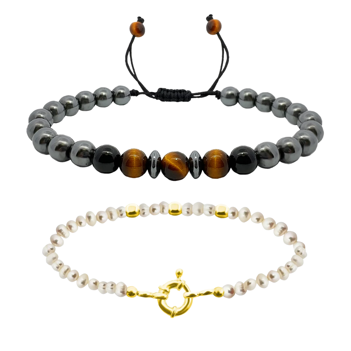 Azon szerelmespárok és barátok számára tervezett karkötő páros, akik együttesen kívánják megélni a stílusos és harmonikus életet, elérhető a makramé férfi karkötő tigrisszem, fekete ónix és hematit ásványaival, melyek nyugtatják az elmét, és az édesvízi fehér gyöngyből és egy nagy sárga arannyal bevont ezüst 925 karabinerrel készült női karkötő – az elegancia kifejezője.