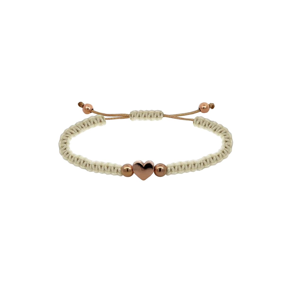 Ez a kivételes, makramé technikával készített karkötő, 18 karátos vörös arannyal bevont szív medállal, nemcsak hogy feldobja outfitjeidet, hanem praktikus kialakításának köszönhetően könnyen fel- és levehető nap mint nap.