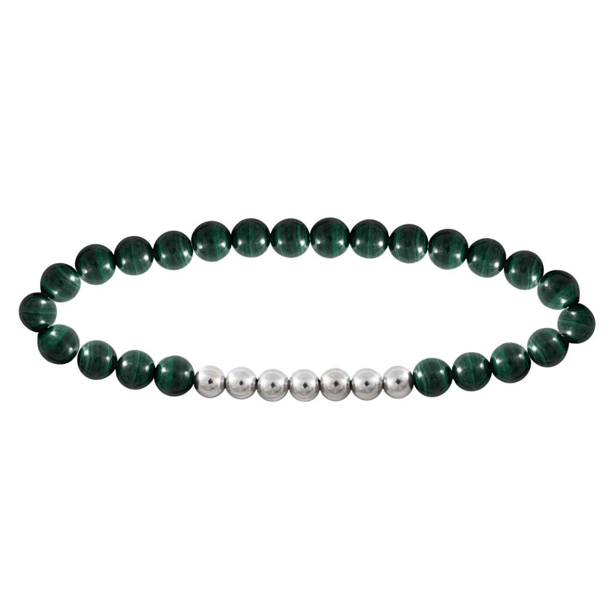 Férfi karkötő kollekciónk ezen darabja a mélyzöld hangsúlyos színével és az ezüst szín eleganciájával hívja fel magára a figyelmet. A malachit hatásainak erősítése érdekében viseld a bal csuklódon! Segíti a tisztánlátást, egyensúlyt és harmóniát teremt, valamint érzelmi gyógyulást biztosít. Az ezüst golyók megtörik a zöld szín uralmát, ezzel tökéletes harmóniát teremtve.