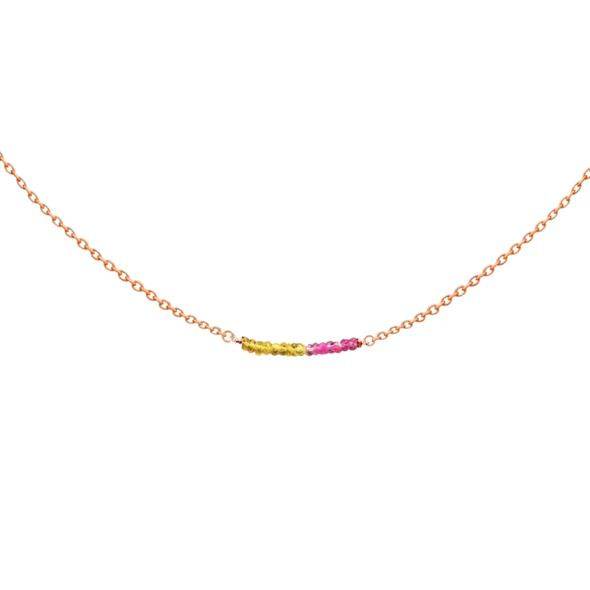 Drágaköves kollekciónk szemet kápráztató darabját viselheted magadon ezzel a gyönyörű nyaklánccal. A sárga zafír és a vörös rubin harmonikus találkozása egy ékszerben, amely benned is felpezsdítheti a tüzet. Alkalmi viseletként ajánljuk.